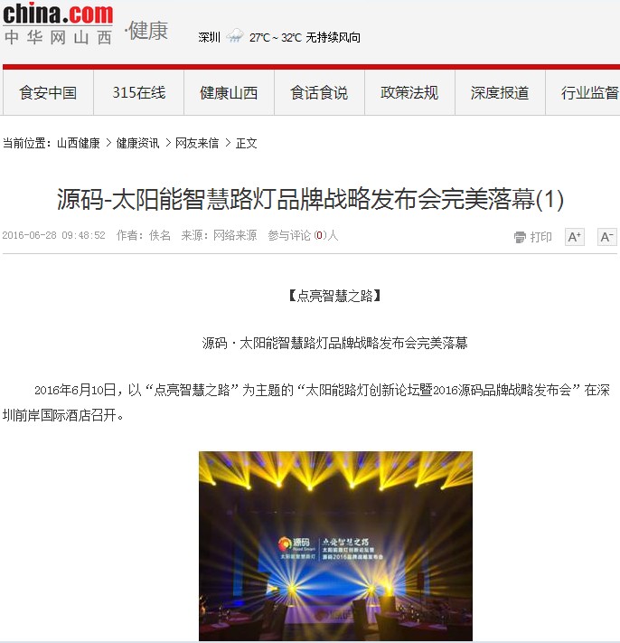 繼源碼在深圳成功舉行太陽能路燈創新論壇暨源碼2016品牌戰略發布會后,引起了各大媒體和行業的廣泛關注,行業專家柴鈺教授表示,此次源碼發布會已經顛覆了行業對傳統太陽能路燈的認知,對太陽能路燈行業的發展指明了方向。在各大媒體的爭相報道下,網上掀起一片關于“源碼”的信息狂潮。